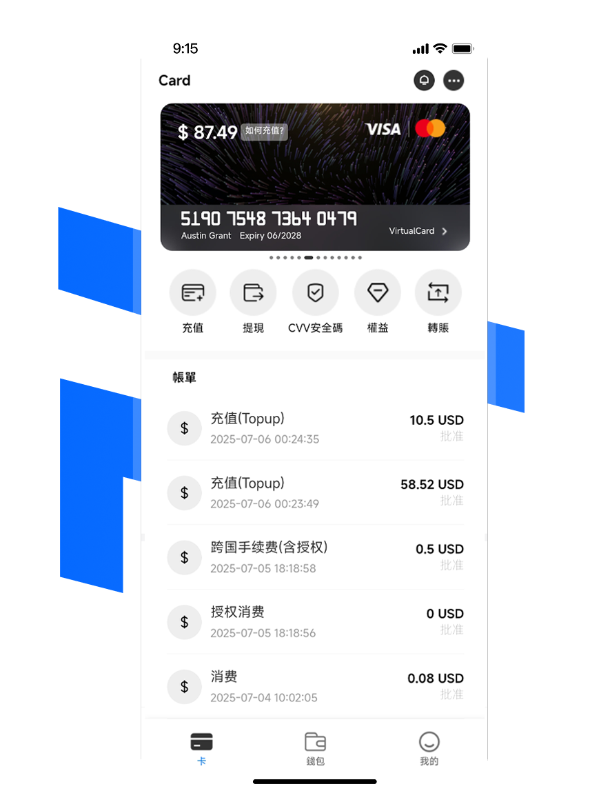 虛擬卡、實體卡、全球轉帳卡、提供您更多的使用場景